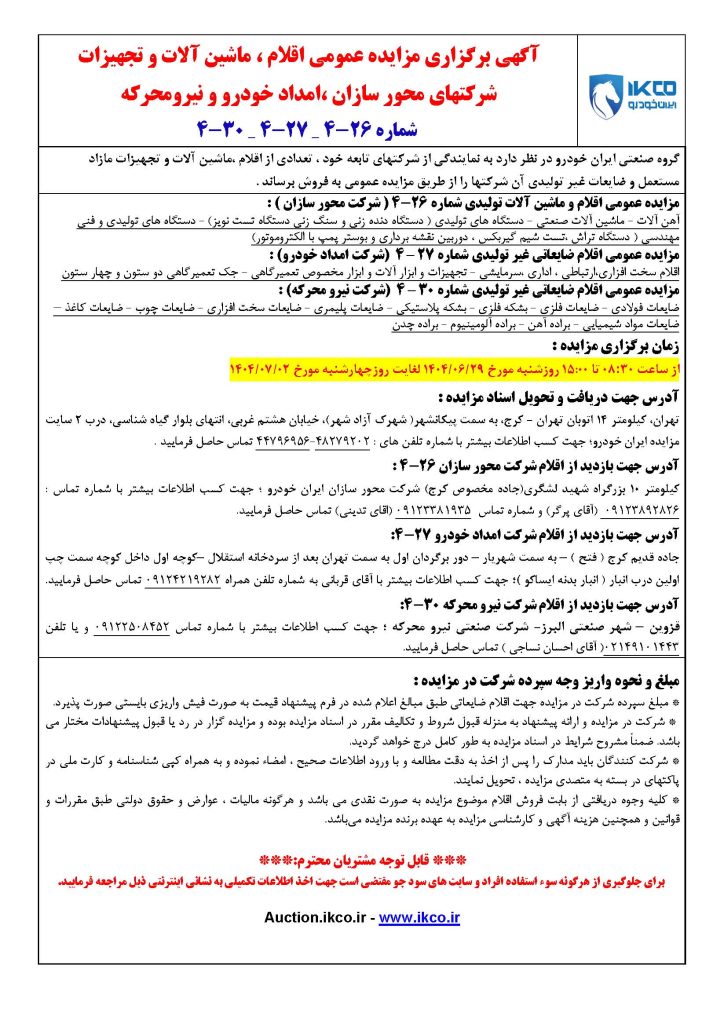 شركت محورسازان ايران خودرو درنظردارد تعدادی از ماشین آلات دست دوم و مستعمل را از طريق مزايده به فروش برساند ،متقاضيان ميتوانند جهت بازديد و دریافت اسناد مزایده ازتاريخ 1404/03/10 لغايت 1404/03/19 به مدت 7 روز كاري از ساعات 8 صبح الي 12 ظهر به كيلومتر 10 جاده مخصوص كرج شركت محورسازان ايران خودرو اداره فروش شركت مراجعه نمايند .